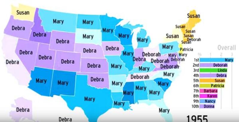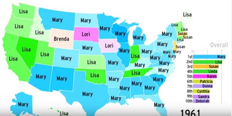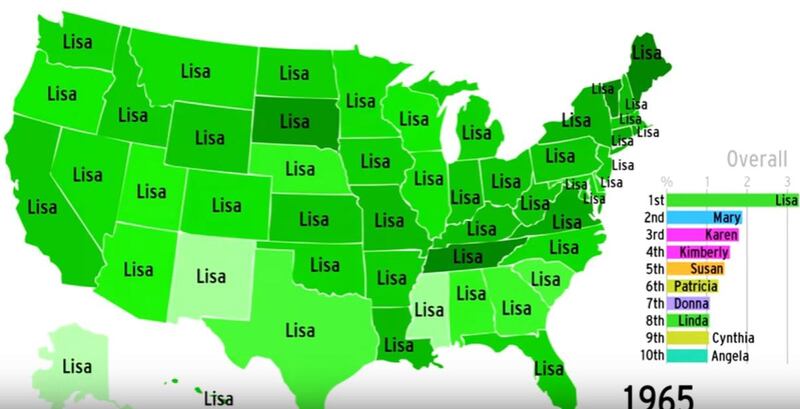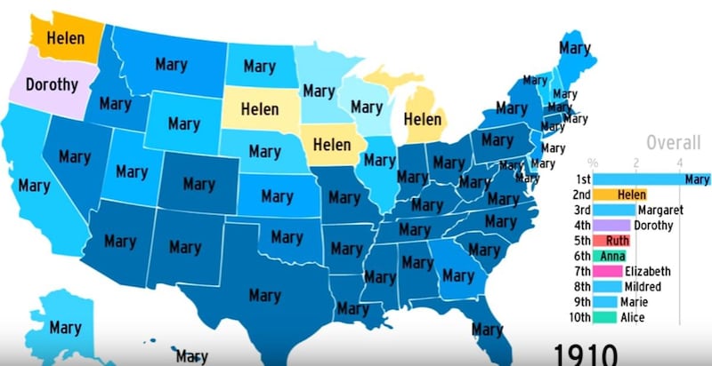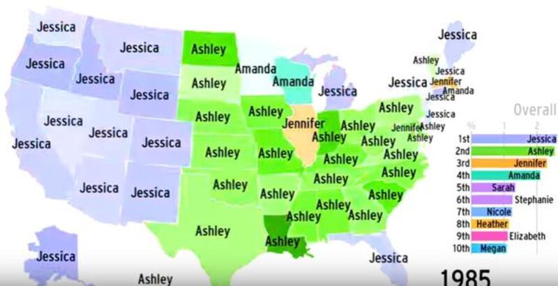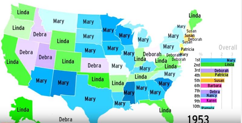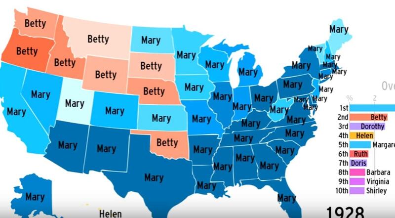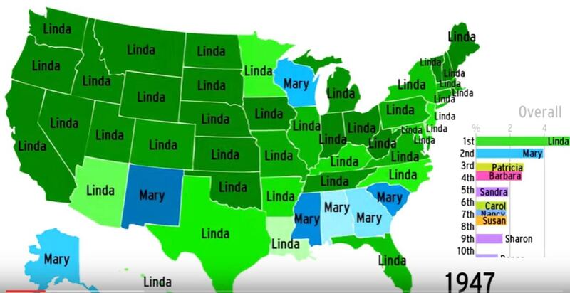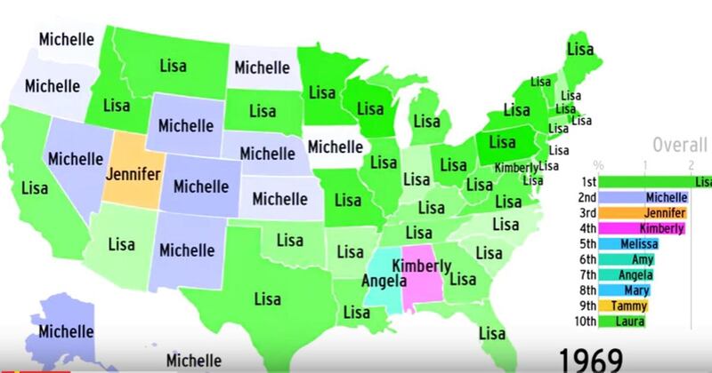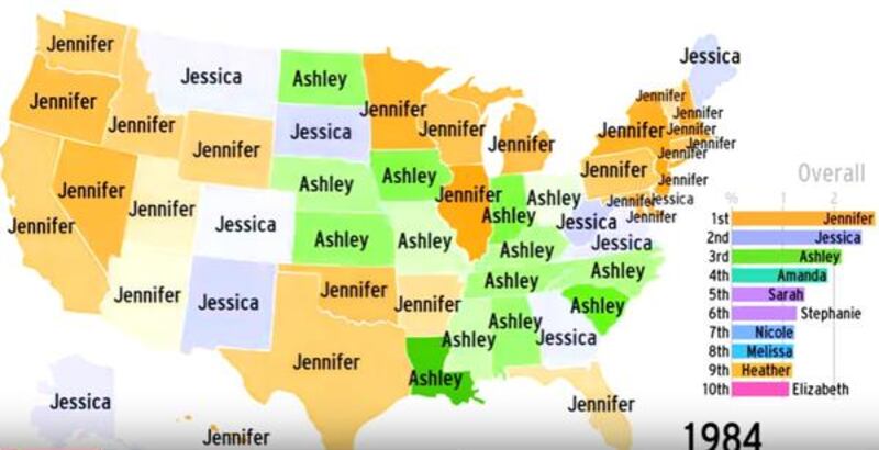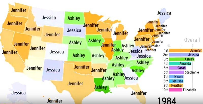 Last year, YouTube video publisher Abacaba shared a video that showed the top baby names by state from 1910 to 2014. The video, set to techno-like elevator music, shows each state’s most popular name change from year to year.