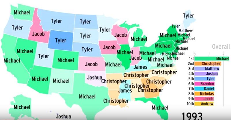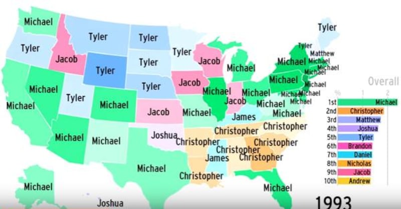 As for boy names, the trend doesn’t move as much. In 1993, Utah was one of the first states with “Tyler” as the most popular name.