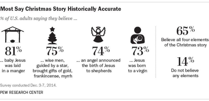 And the bulk of Americans believe in the story of Christmas, according to Pew. Close to 81 percent believe that Jesus laid in a manger, with 75 percent believing that the three wise men followed a star to bring their gifts to the baby Jesus.