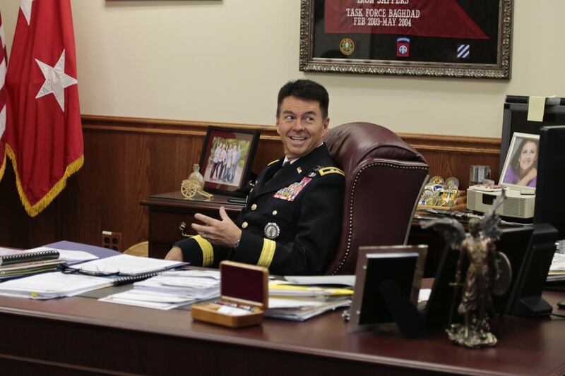 He is a battle-tested, decorated soldier who has disarmed bombs, picked through rubble for the dead, pursued bad guys and seen friends killed in firefights. He just doesn’t wear it on his countenance or in his demeanor. He is an open, pleasant man with a full head of close-cropped hair and the square-shoulder, slender physique of a former track athlete, which he is. At 57, he looks younger than his years and exactly like the guy Hollywood would cast for the role of a military officer, albeit a gentler version.