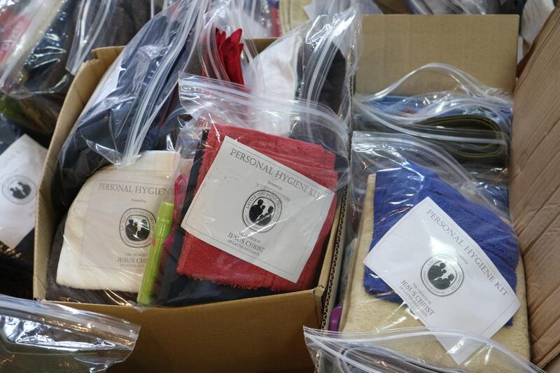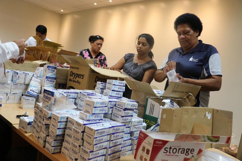 At the LDS Church offices in Suva, members and missionaries worked Tuesday to assemble hygiene kits requested by the Ministry of Health. The kits, purchased with local goods, were put on boats to Gau and the Lau island group.