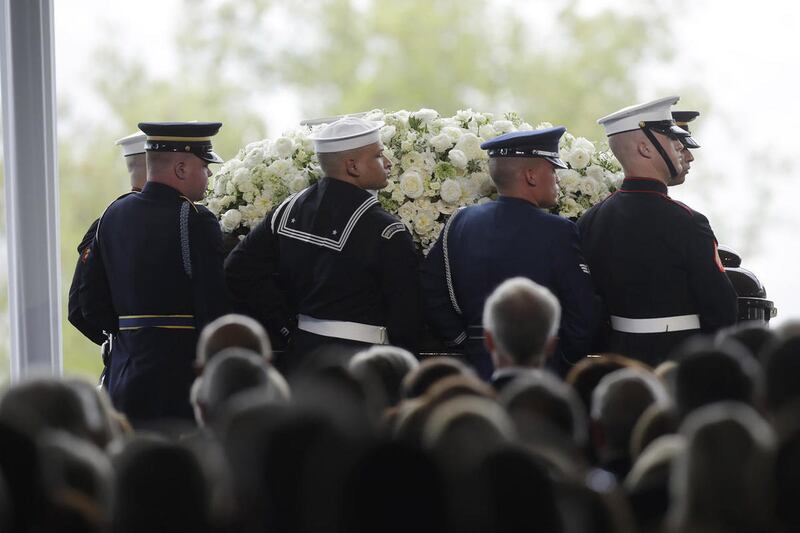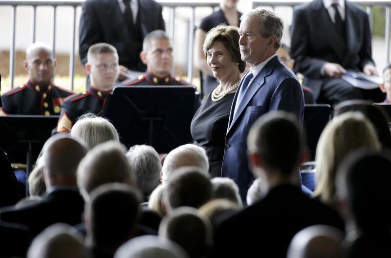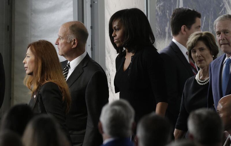 Among those in the front row were first lady Michelle Obama, who was seated next to former President George W. Bush. Hillary Clinton sat between Bush's wife, Laura, and former first lady Rosalynn Carter.