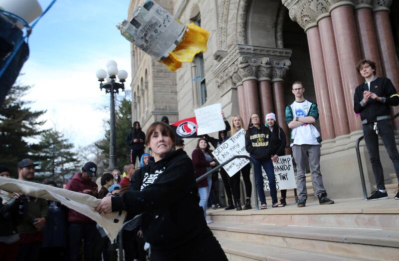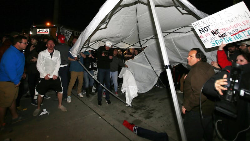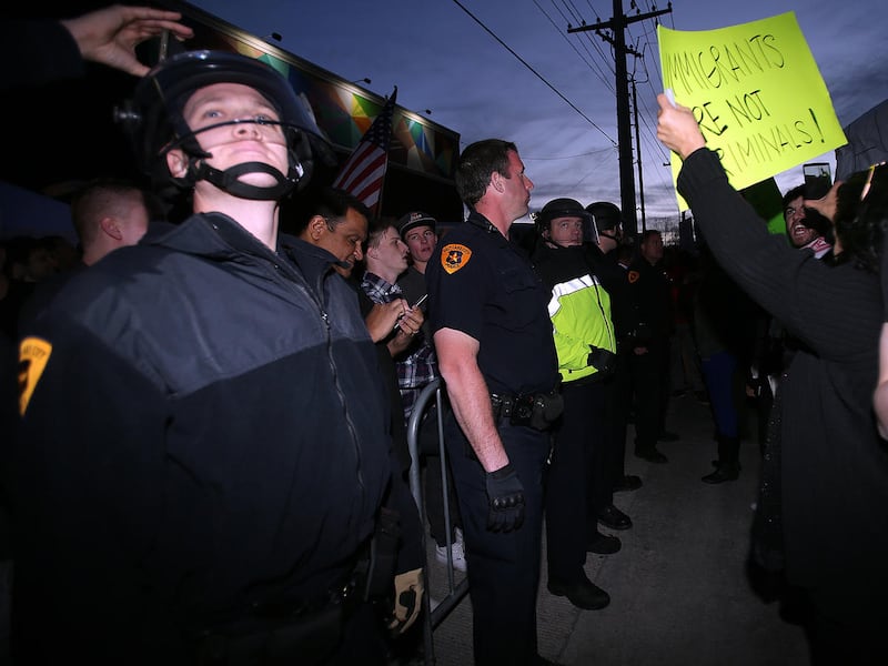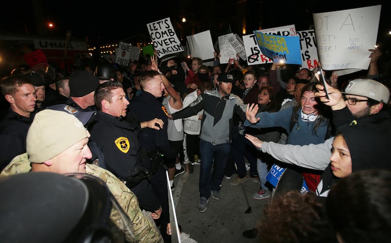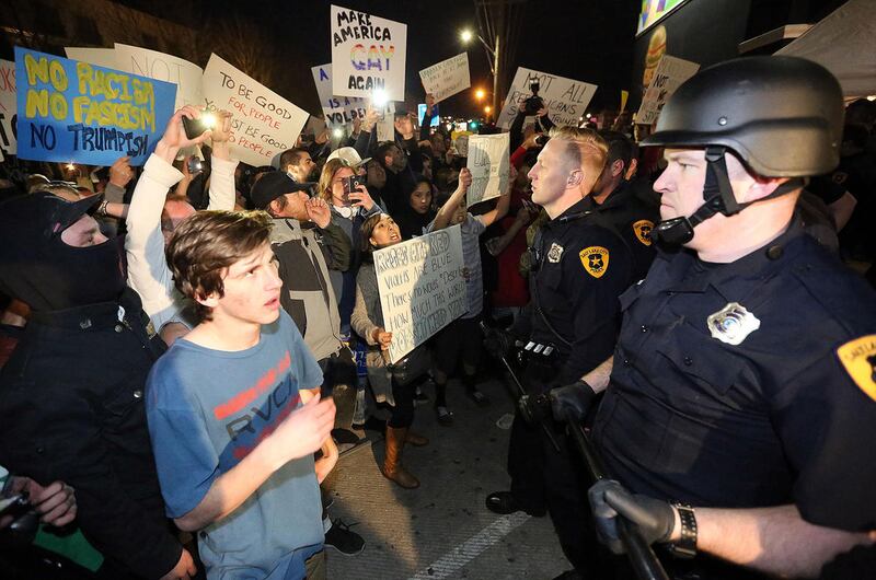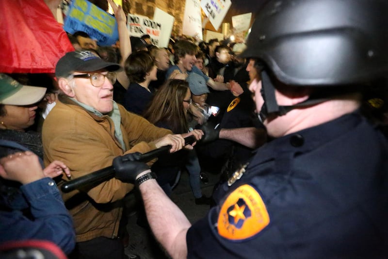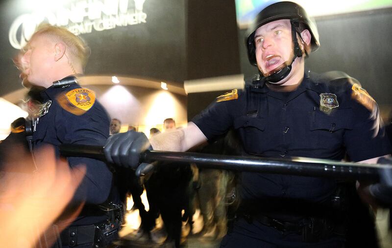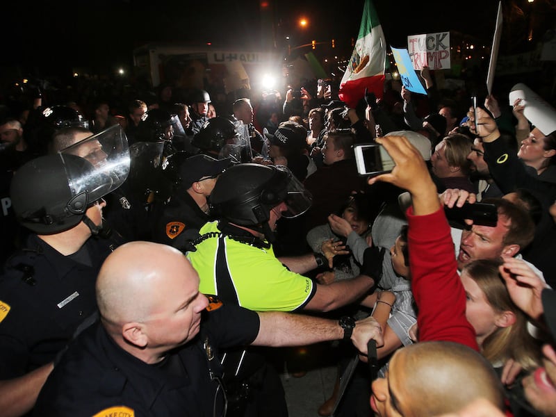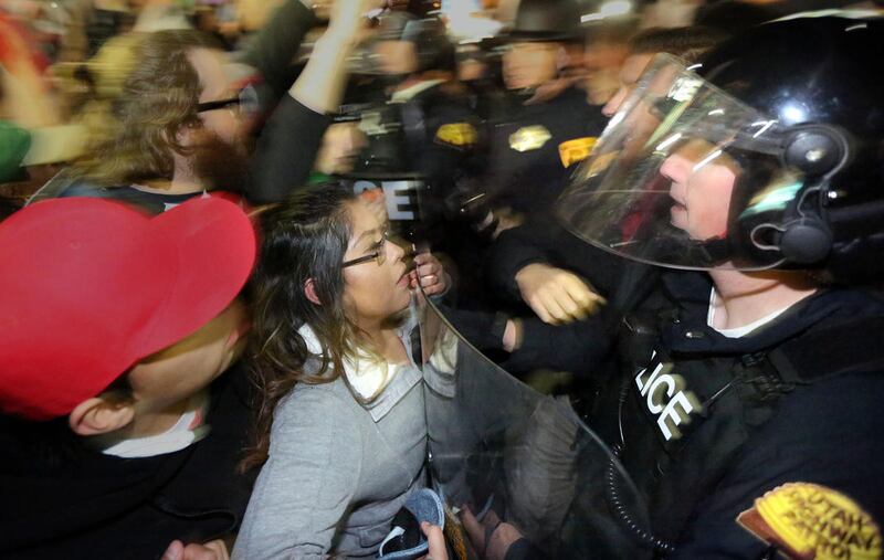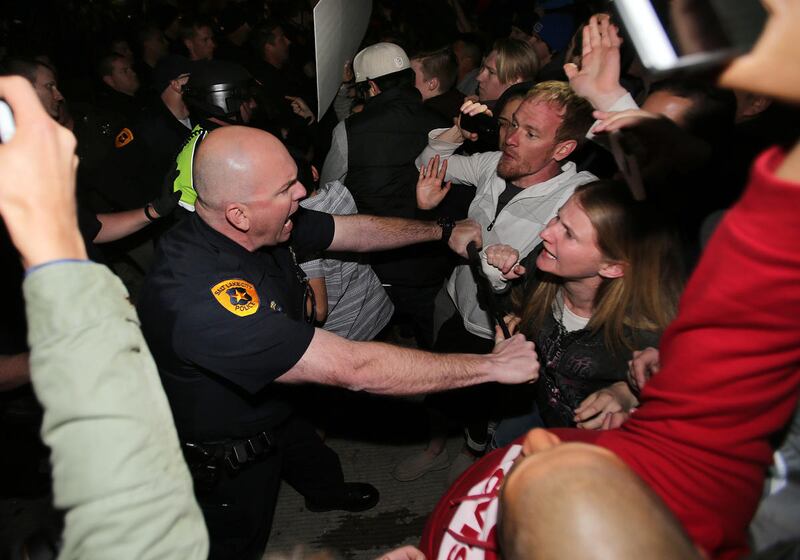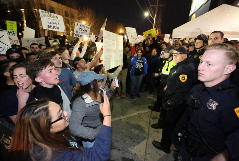 Protesters at one point forced their way to the front door of the venue while Trump was speaking, taking down a portable awning along the way. Police eventually moved them back.