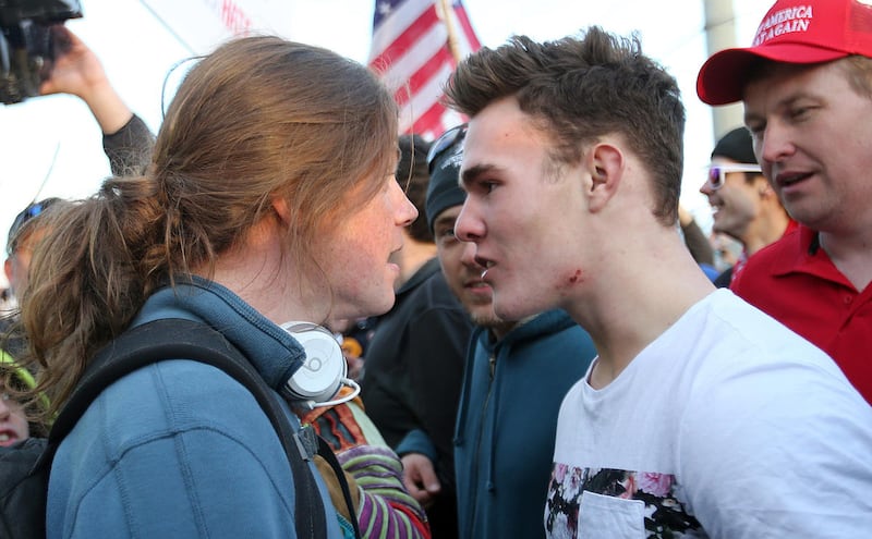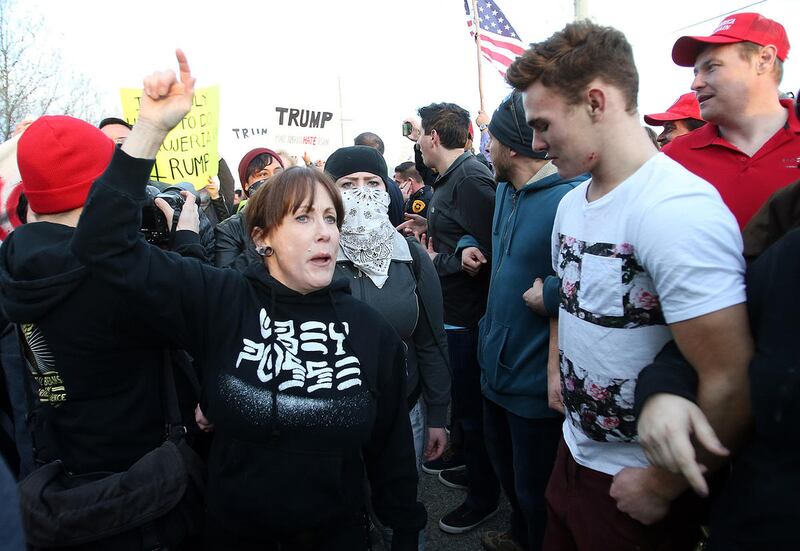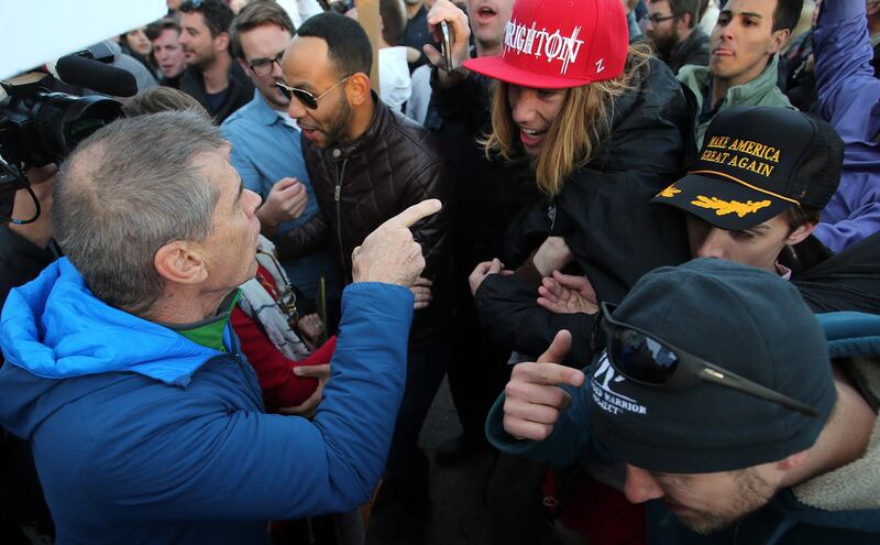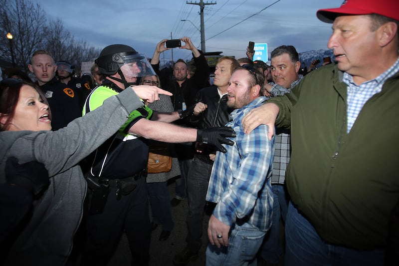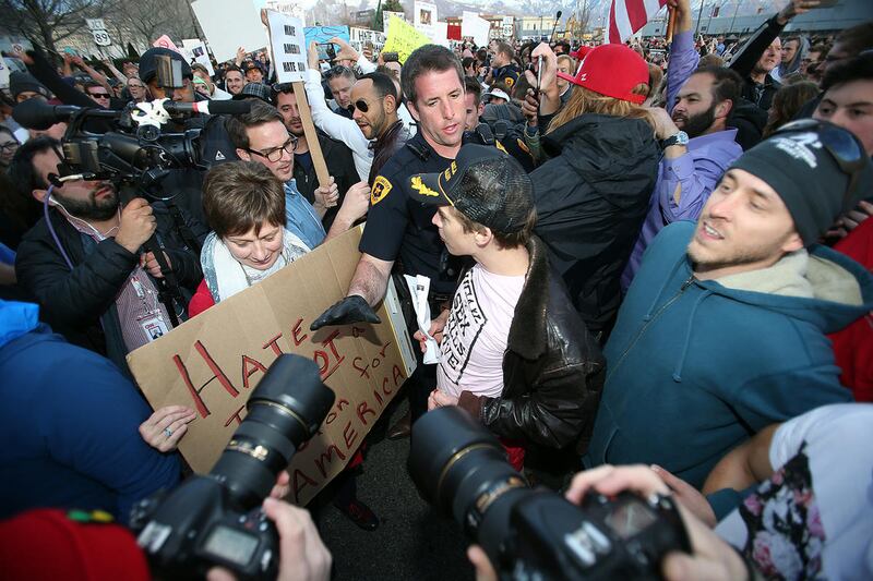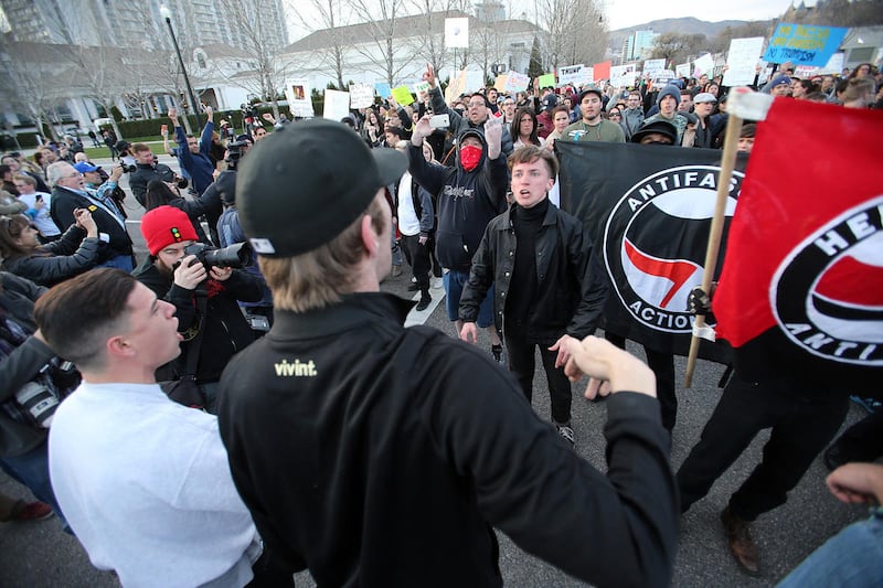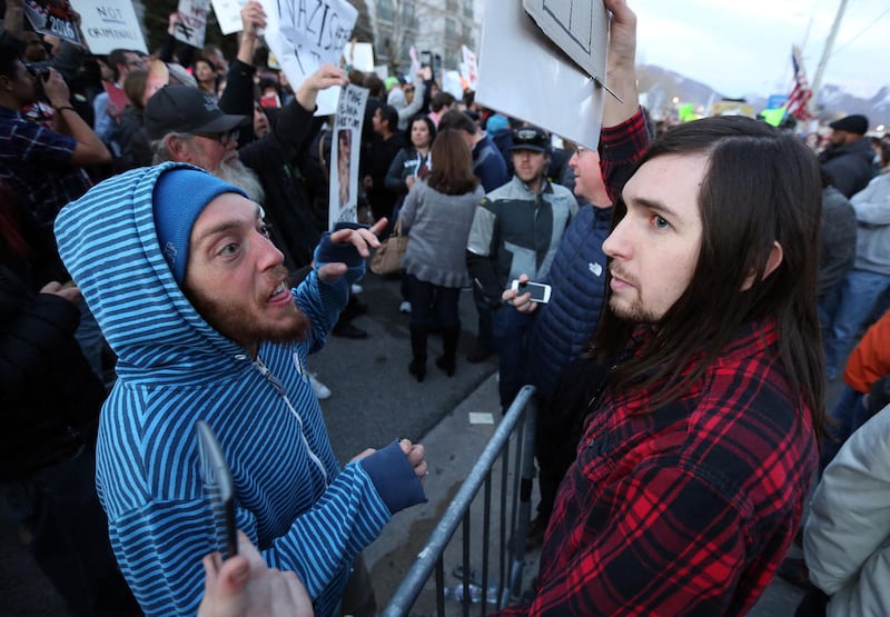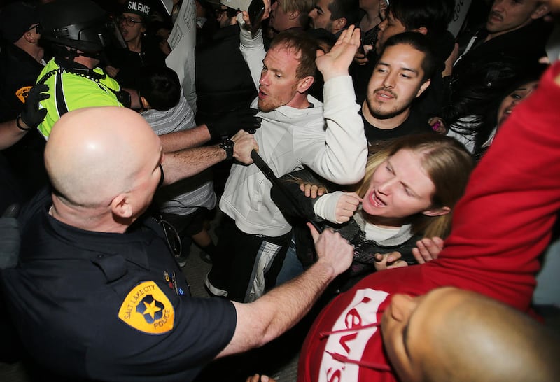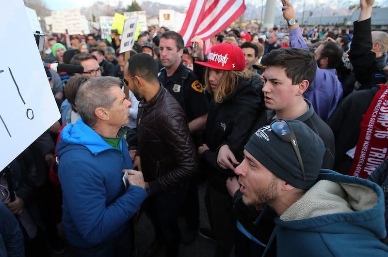 The opposing sides chanted at each other — "Trump!" "No hate!" — face to face on 600 South between State and Main. But aside from pushing and shoving the scene didn't turn violent.