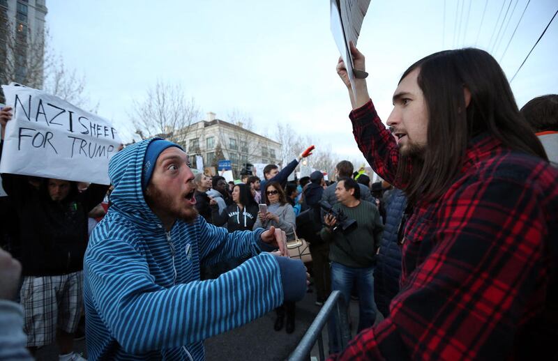 Many of them lined the south side of 600 South, while protesters holding signs reading, "Mormons (heart) Muslims" and "Deport Donald" lined the north side. There was a brief shoving match when a Trump supporter holding a blue "Trump: Make America Great Again" scarf stood among the protesters.