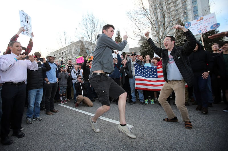 A dance-off between broke out at one point between the pro- and anti-Trump groups gathered in a large circle in the road.