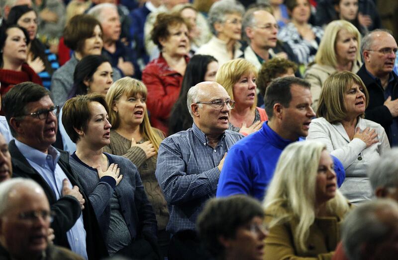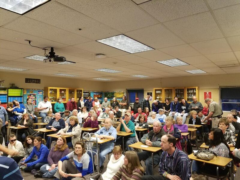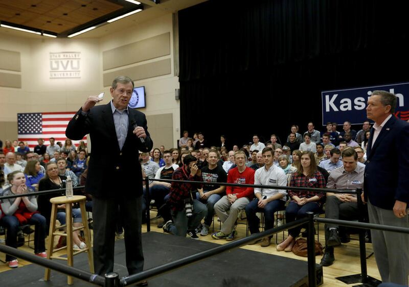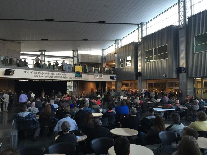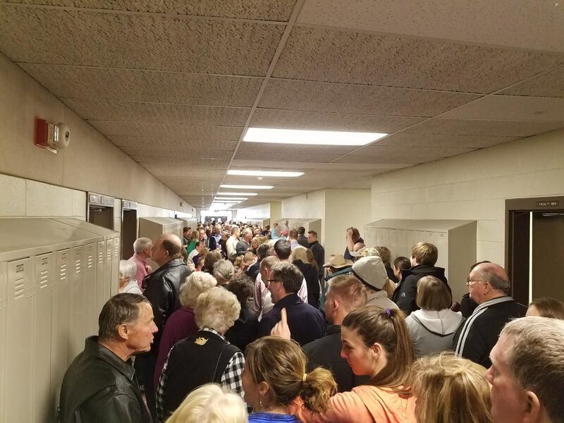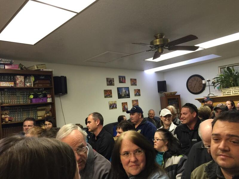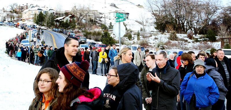At a Republican caucus at a high school in South Jordan, about 3,000 people packed into the hallways, squeezed shoulder to shoulder while trying to make their way to individual precinct meetings held in classrooms, a cafeteria and auditorium.
