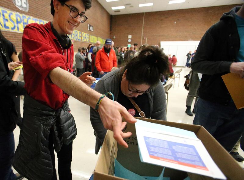 Some voters packed into hot classrooms, with adults squeezed into student desks as others sat on the floor nearby or stood along the walls. Some who couldn't fit in classrooms stood outside in hallways while listening to the discussion through an open door. They voted on their delegates for local elections before casting their vote for president.
