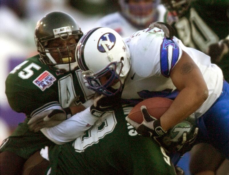 Following Kalani’s sophomore year at Timpview High, the family moved again. Tom had met and married a woman in Provo and a couple of years later they moved to St. Louis to be near her family. The marriage, which produced two children, crumbled soon after their arrival, but Tom decided to let Kalani, a rising football star who was being recruited by Division I schools, finish high school there.