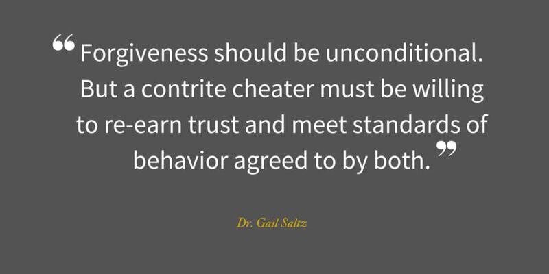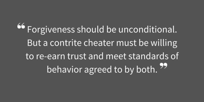 Forgiveness should be unconditional. But a contrite cheater must be willing to re-earn trust and meet standards of behavior agreed to by both. Saltz said it must always include no contact with the partner in infidelity. If that means changing jobs because you cheated with someone at work — a spectacularly bad idea anyway, she added — then so be it.