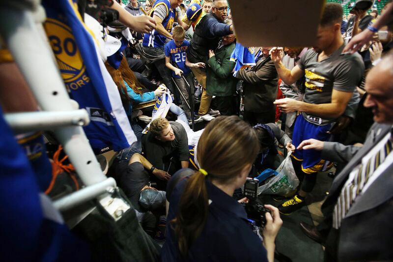 At least two of the fans — one minor and one adult — fell about 4 feet onto the floor just in front of Curry after the weight of a large group of excited spectators caused the railing to become dislodged while trying to get the reigning MVP’s attention.