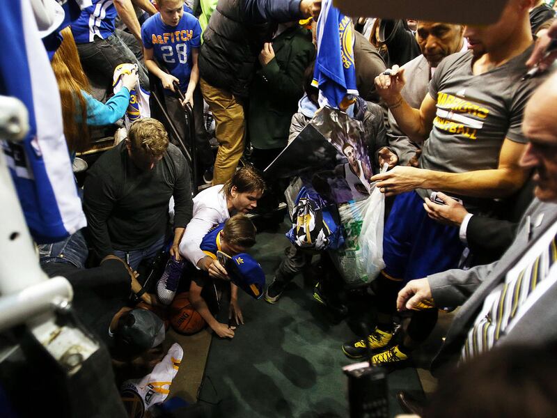 Curry stopped to sign some autographs when the crowd pushed fans into the railing so hard that it disassembled and fell to the ground.