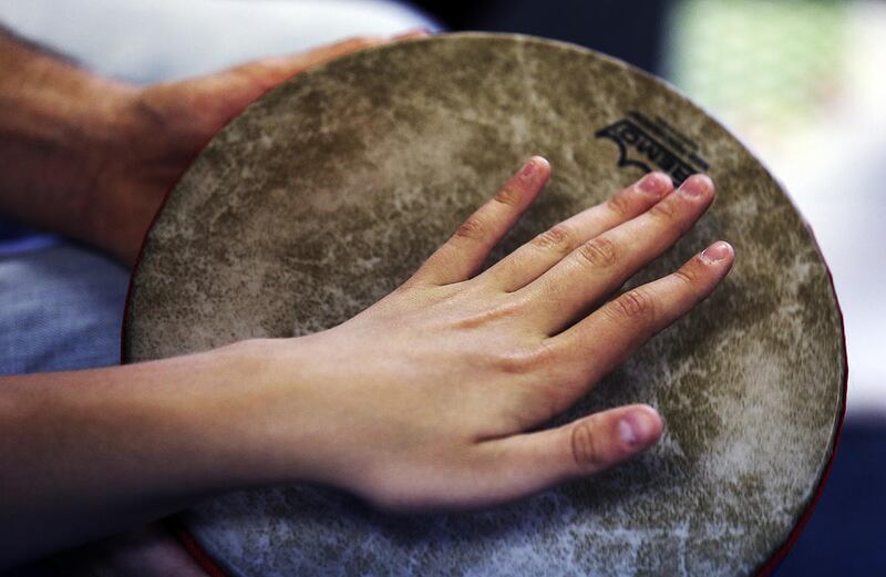 Lighty plays the guitar over her head and encourages the students to do the same with the drums, tambourines and other instruments she passed out earlier. Through music, rhythm and vibration, and by taking turns, kids learn things they can take back to the classroom.