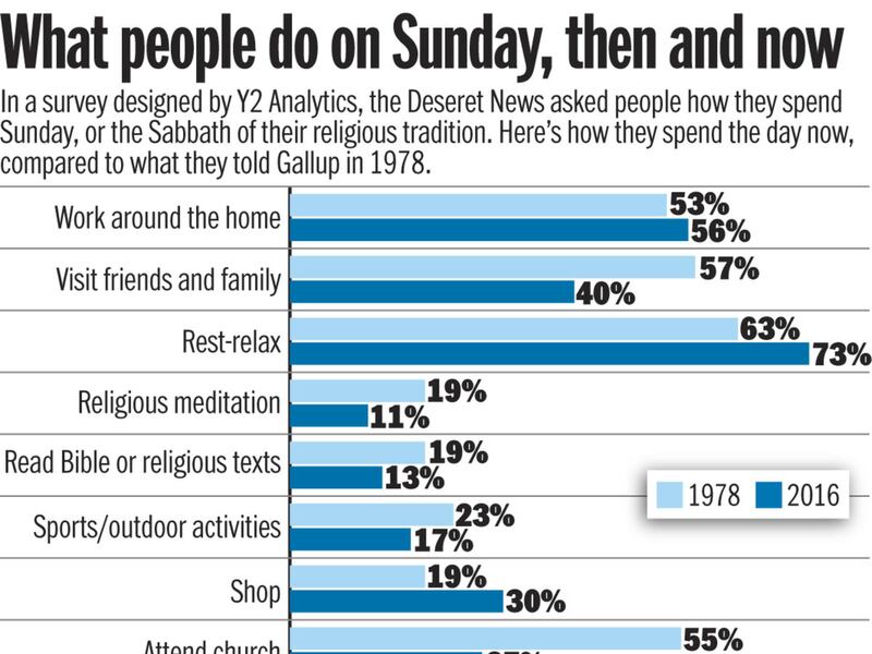 In a recent Deseret News survey, just 38 percent of respondents said they "strongly agreed" that it's important for society to have a day of spiritual rest, and only half said the Sabbath has personal spiritual meaning, compared to 74 percent in a 1978 Gallup poll.