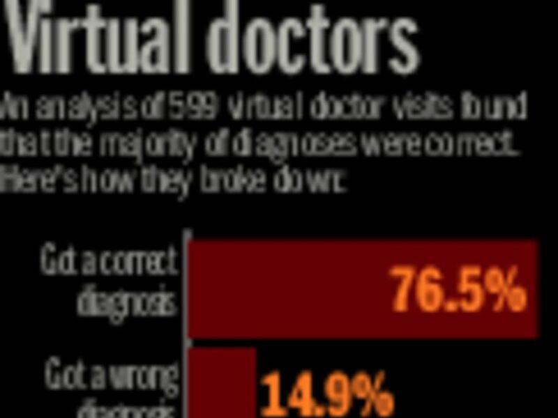 When actors posing as patients consulted with virtual doctors about common conditions that included ankle pain, viral pharyngitis and low back pain, 76.5 percent got correct diagnoses, and the rate of prescribing was similar to that of in-office visits, a study published April 4 in JAMA Internal Medicine said.