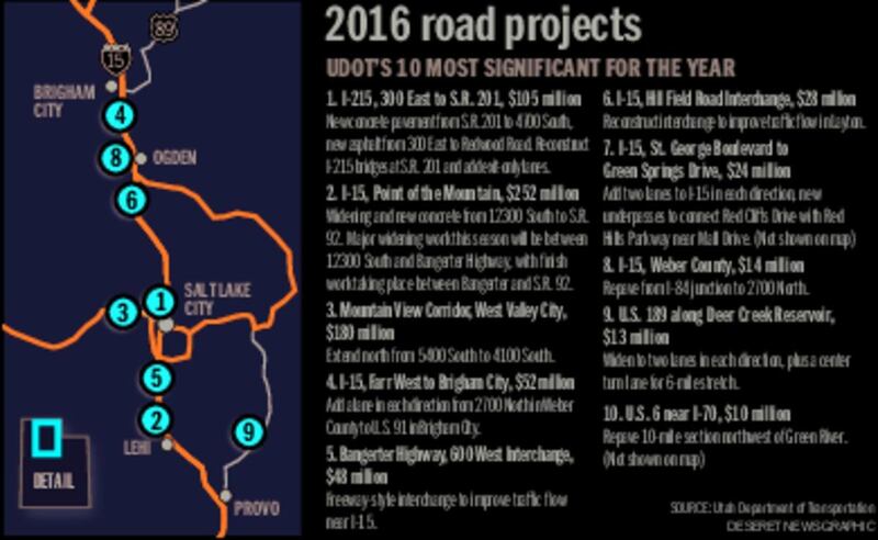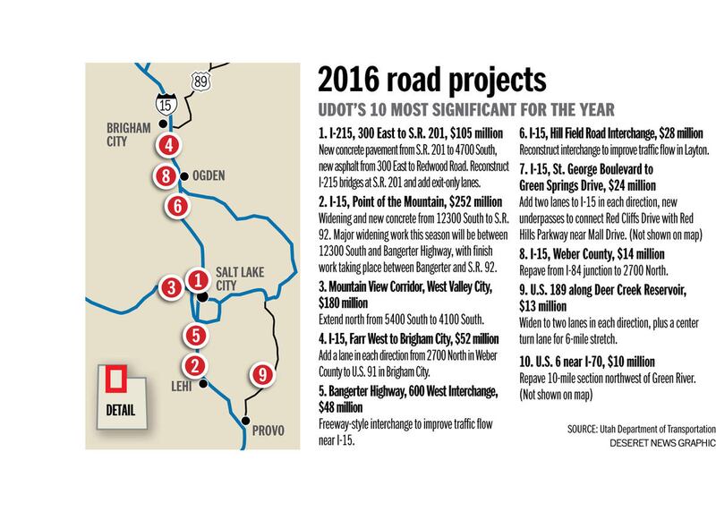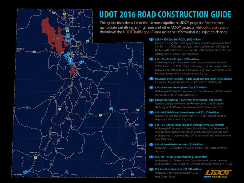 The Utah Department of Transportation Wednesday announced its list of top 10 projects for 2016. At the top of the list is a $105 million reconstruction of I-215 in western Salt Lake County, which is scheduled to begin next month and expected to be completed late next year.