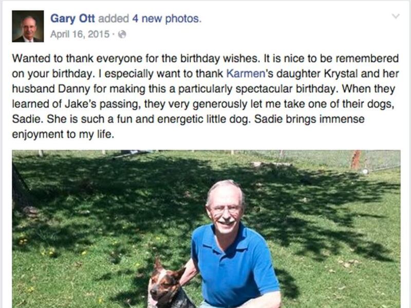 • Ott has also posted photos on his Facebook page describing “life on the ranch,” even though address records do not indicate Ott owns any rural property. Other posts depict interactions between Ott and Sanone. On Feb. 6, 2016, Ott tags Sanone in a picture of two of his dogs playing together. In a April 16, 2015, post, Ott mentions Karmen and her daughter, thanking them for celebrating his birthday with him. On Oct. 1, 2014, Sanone and Ott are also pictured together at the Utah Governor’s Mansion.