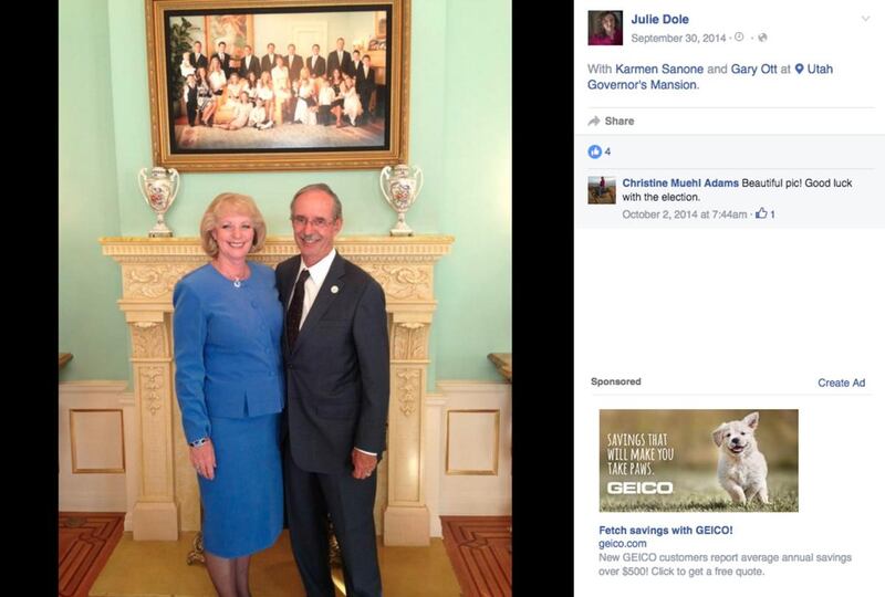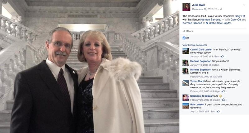 Yet a picture posted in 2012 on Dole’s Facebook page shows Ott and Sanone together at a Christmas party at the state Capitol. Dole captioned the photo: “The Honorable Salt Lake County Recorder Gary Ott with his fiancée Karmen Sanone.”