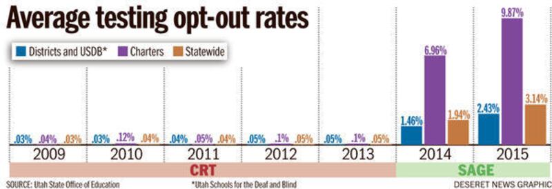In 2013, just prior to the implementation of SAGE, 65 out of 85 charter schools in Utah, and 19 of the state's 41 school districts, had an opt-out rate of zero, according to data obtained by the Deseret News through a public records request.