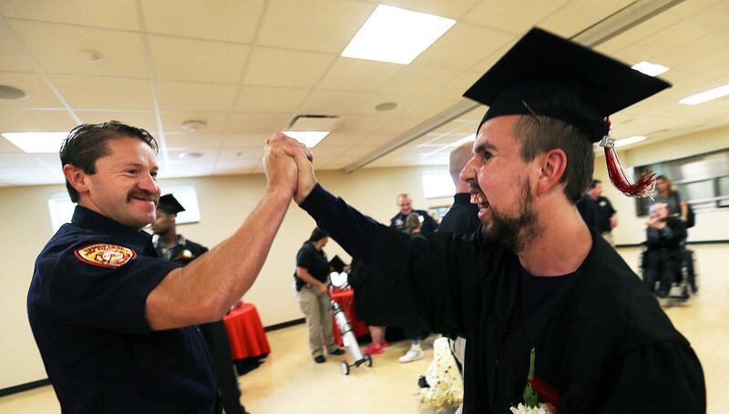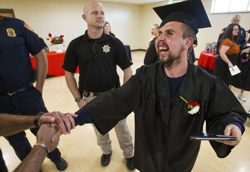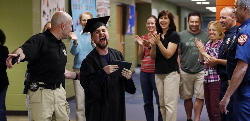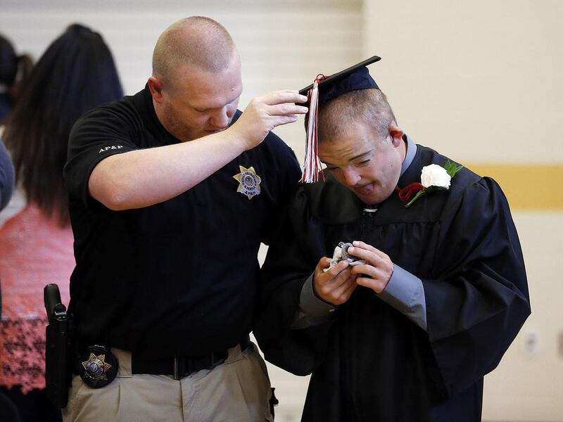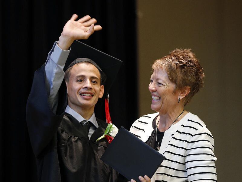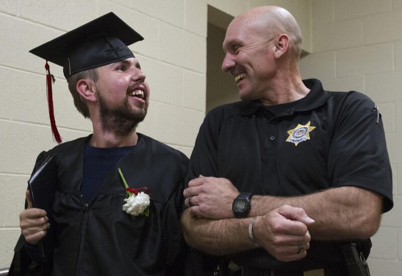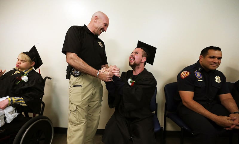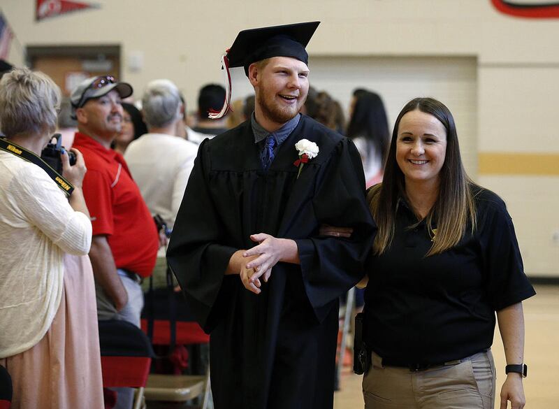 Mischa Farr walks with Adult Probation and Parole agent Dean Adam, left, while being congratulated after receiving his diploma during the Hartvigsen School graduation in Taylorsville on Tuesday. Local law enforcement officials were on hand to escort the special needs students during the ceremony.