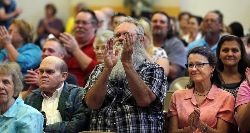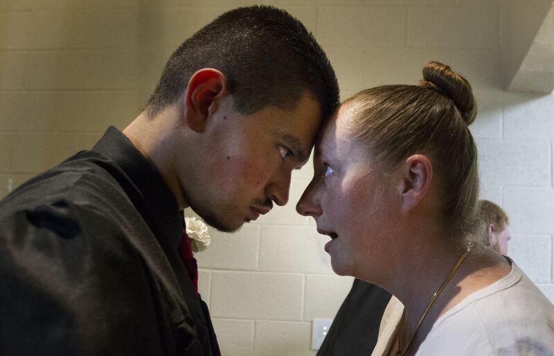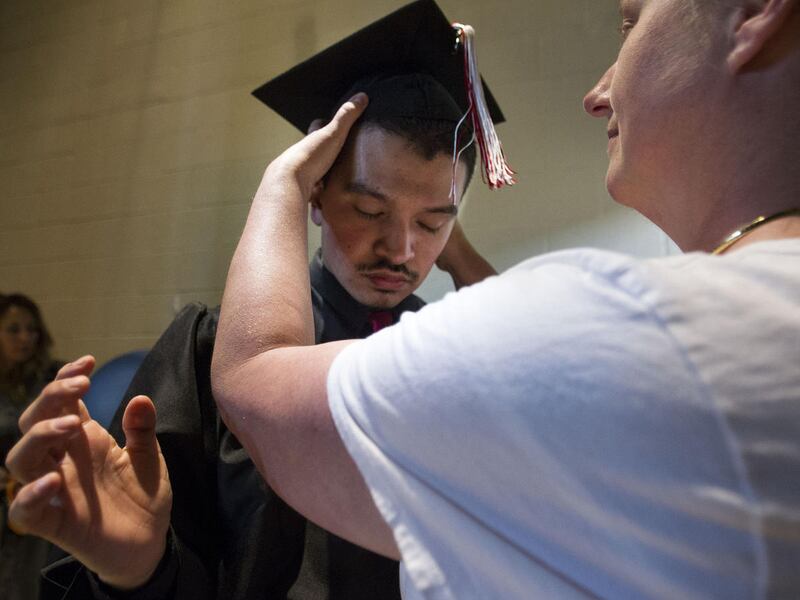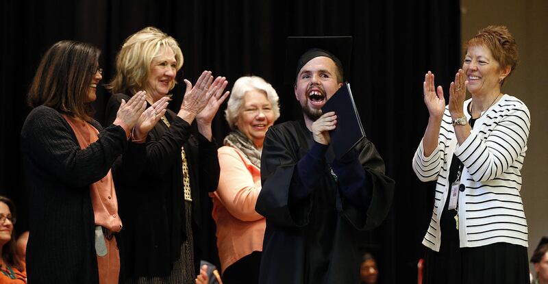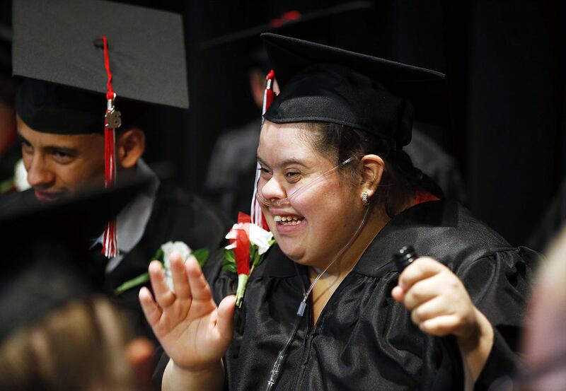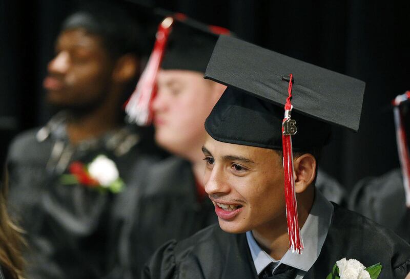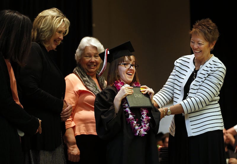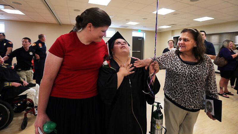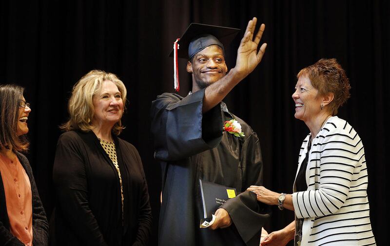 Mischa Farr walks with Adult Probation and Parole agent Dean Adam, left, while being congratulated after receiving his diploma during the Hartvigsen School graduation in Taylorsville on Tuesday. Local law enforcement officials were on hand to escort the special needs students during the ceremony.