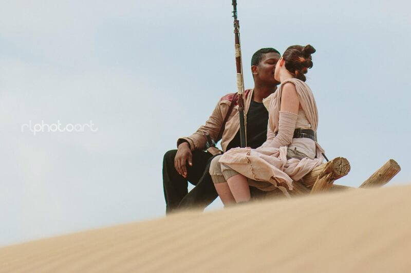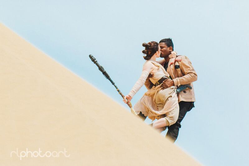 Together they created a Facebook page and a Twitter account titled "The real Finn and Rey," spent about three weeks responding to requests for interviews and more pictures. With their soon-to-be wedding photographer, Robert Lance, they set out to the Little Sahara sand dunes for a photo shoot recreating the fictional planet of Jakku where their characters first meet and including a breathtaking picture of Victor Sine dipping his costumed bride-to-be for a kiss atop a dune.