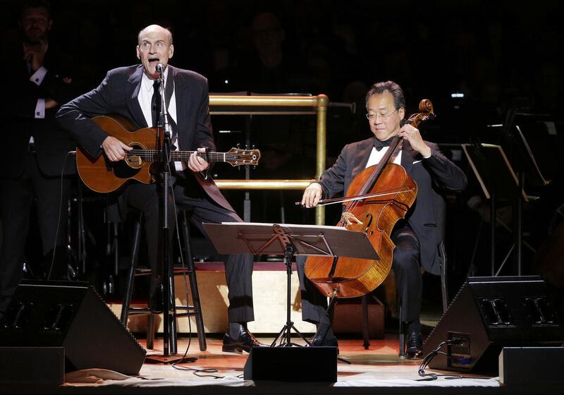 Taylor, his voice having lost none of its sweetness at age 68, sang George Harrison's "Here Comes the Sun" accompanied by Yo-Yo Ma and paid tribute to Prince when he inserted "purple" before "rain" in "Shower the People." All the performers came on stage for the encore of Roger Edens' "The Joint is Really Jumpin' in Carnegie Hall," made famous by Judy Garland.