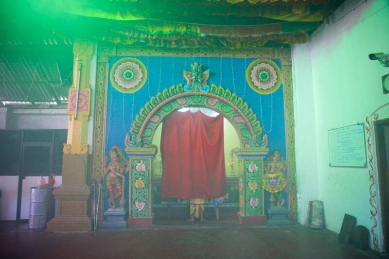 At a stepped altar, a Hindu priest burns offering of fruits, which in Israelite (and archaic Hindu) times would have been sacrificial meat. Hindu shrines often have veils behind which priests can officiate. The haze in this photo is from burning incense and sacrifices.