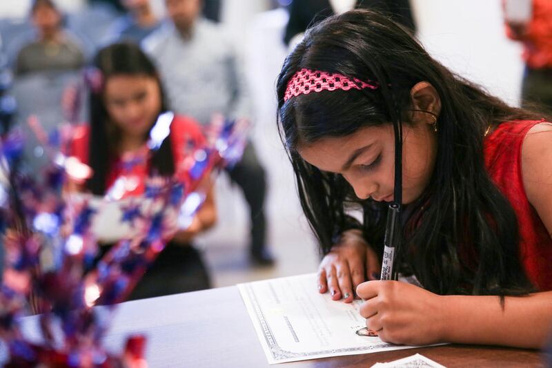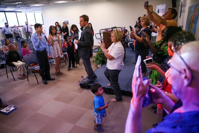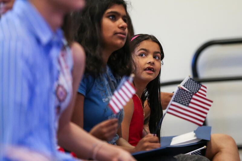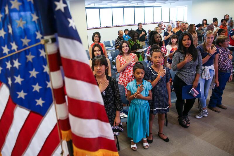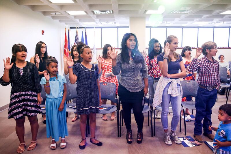 Soon-to-be citizens and guests stand to recite the Pledge of Allegiance during a naturalization ceremony at the U.S. Citizenship and Immigration Services office in Salt Lake City on Thursday. The ceremony recognized 17 children from seven countries — Belgium, Chad, Iran, Mexico, Nepal, the Russian Federation and Thailand — who have obtained citizenship through their parents. Some were adopted by U.S. citizen parents; others derived citizenship when their immigrant parents became naturalized citizens.