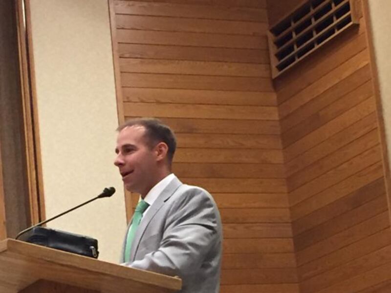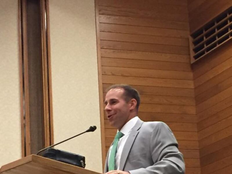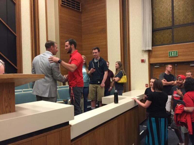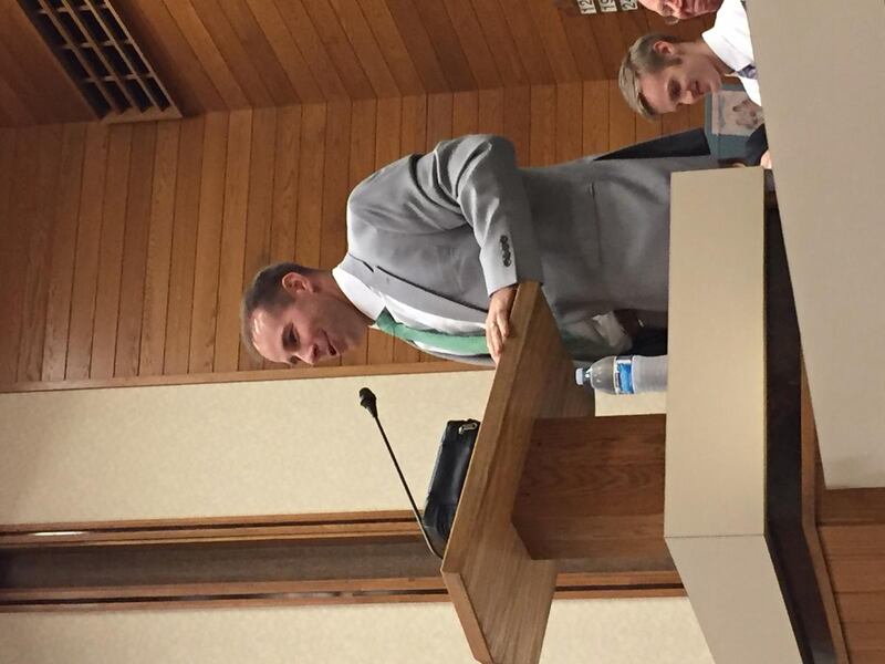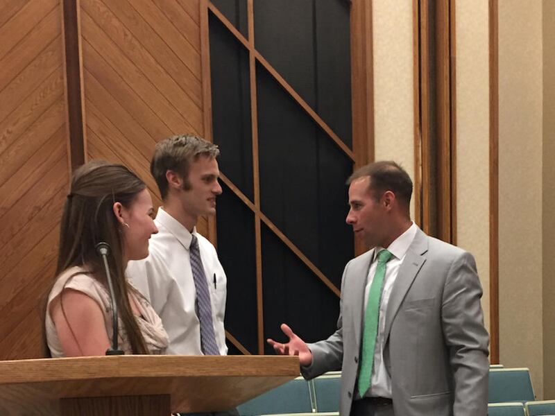 After Scalley concluded his remarks, an institute leader asked Scalley to return to the pulpit and say a few words about his experience as a missionary for the LDS Church in Munich, Germany.