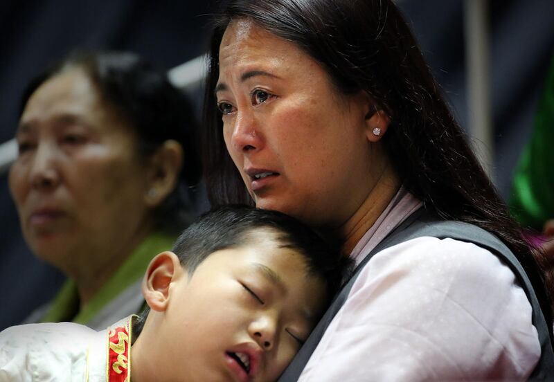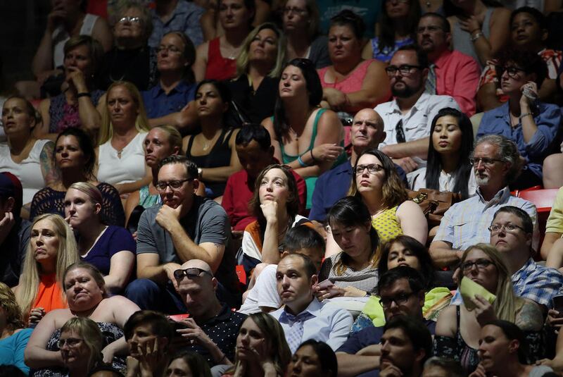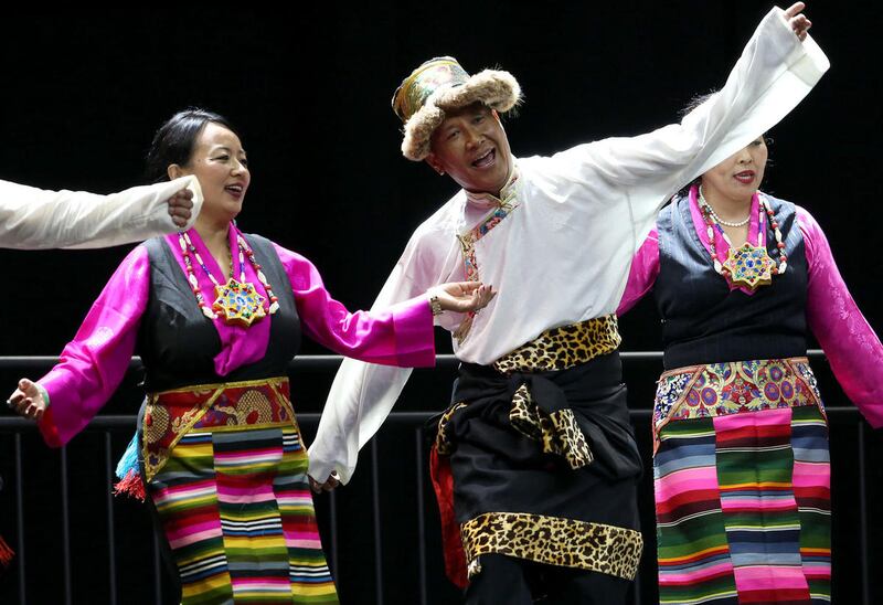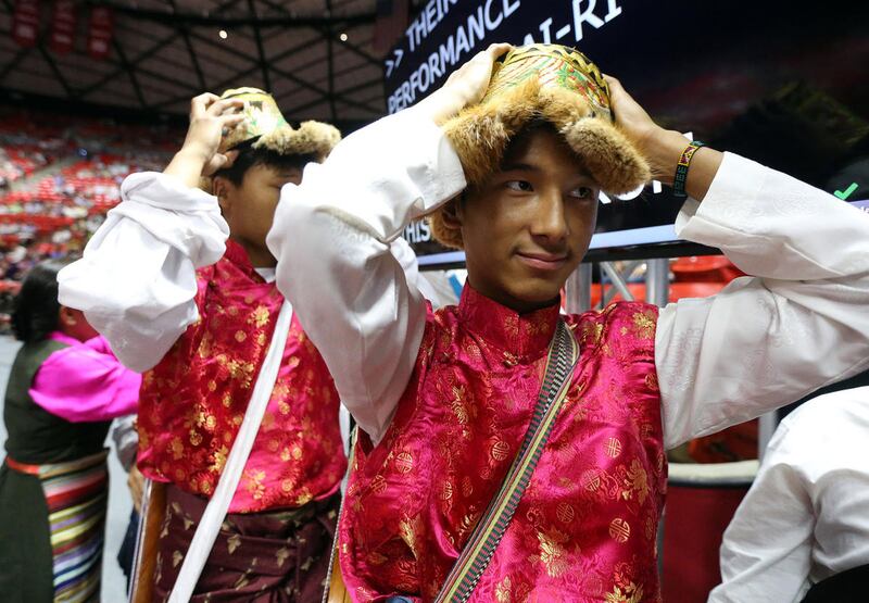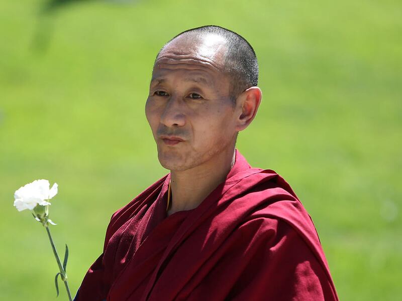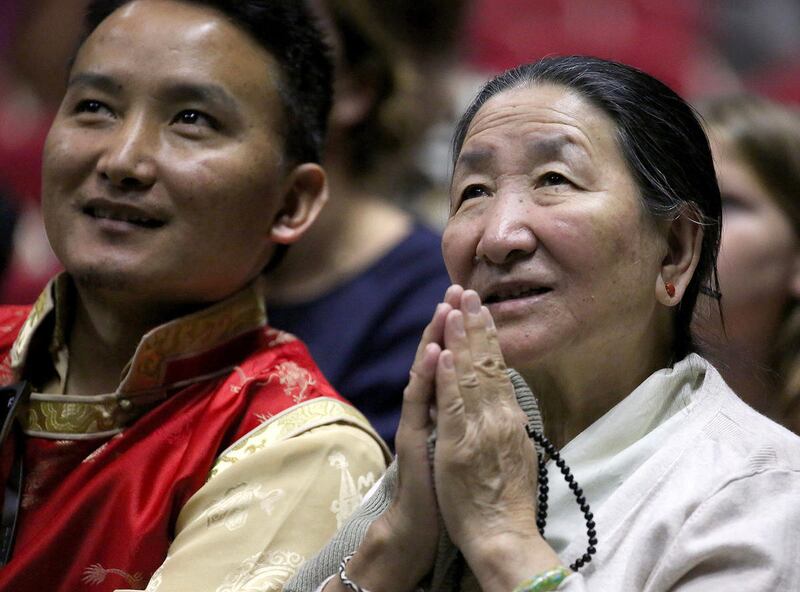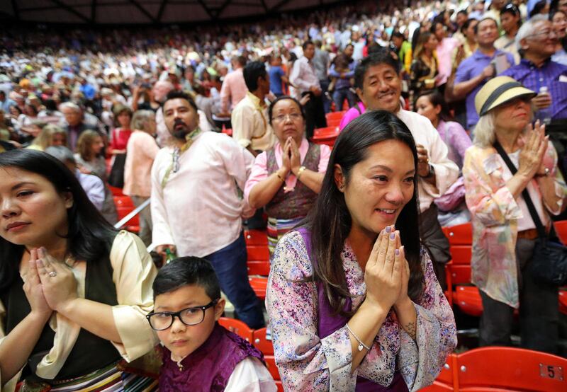 As the Buddhist spiritual leader entered the arena, the crowd rose to its feet and fell silent as it waited for him to speak.