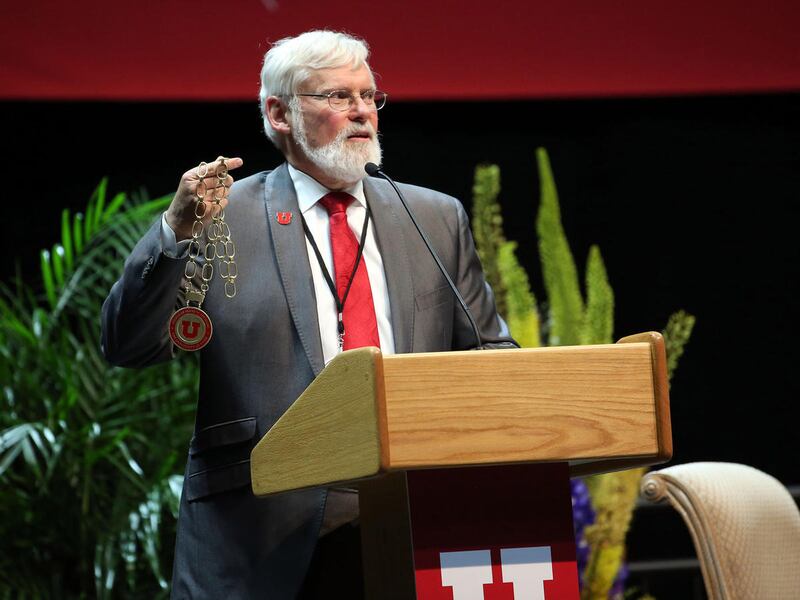 He said simply, "Hello," then won over the crowd by donning a University of Utah visor and a presidential medal presented to him by U. President Dave Pershing. He wore both throughout his presentation.