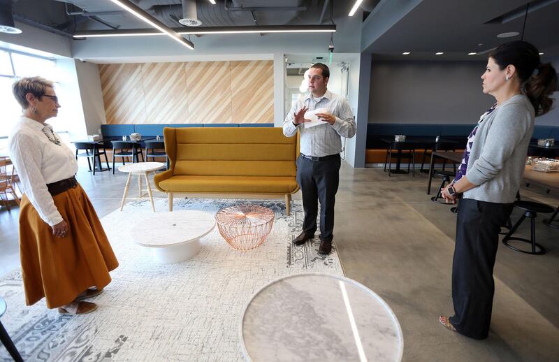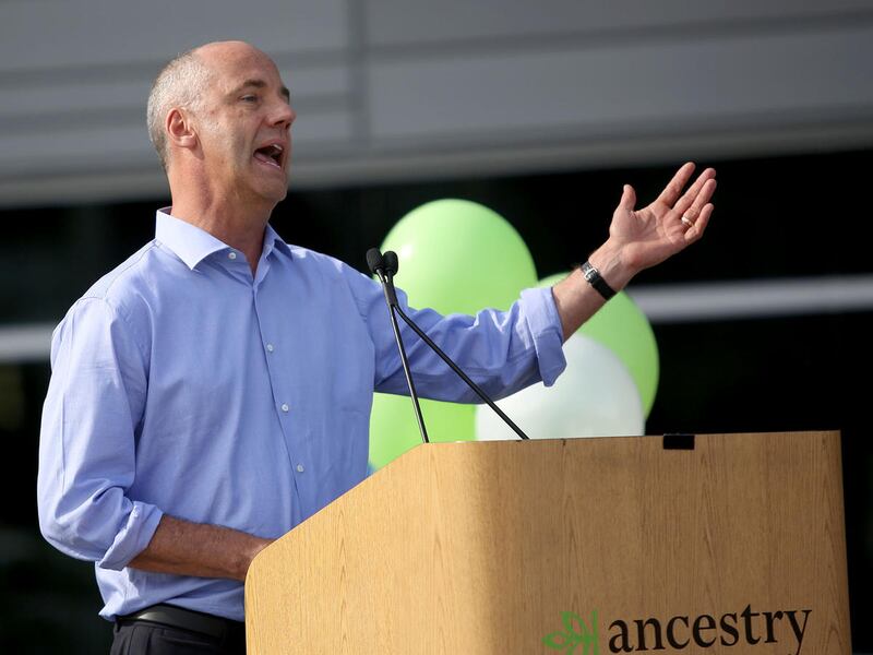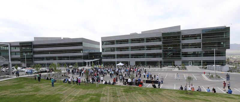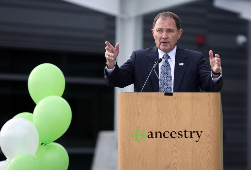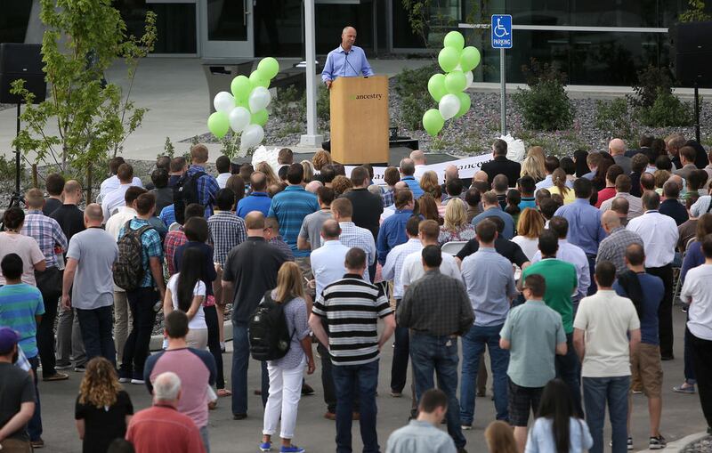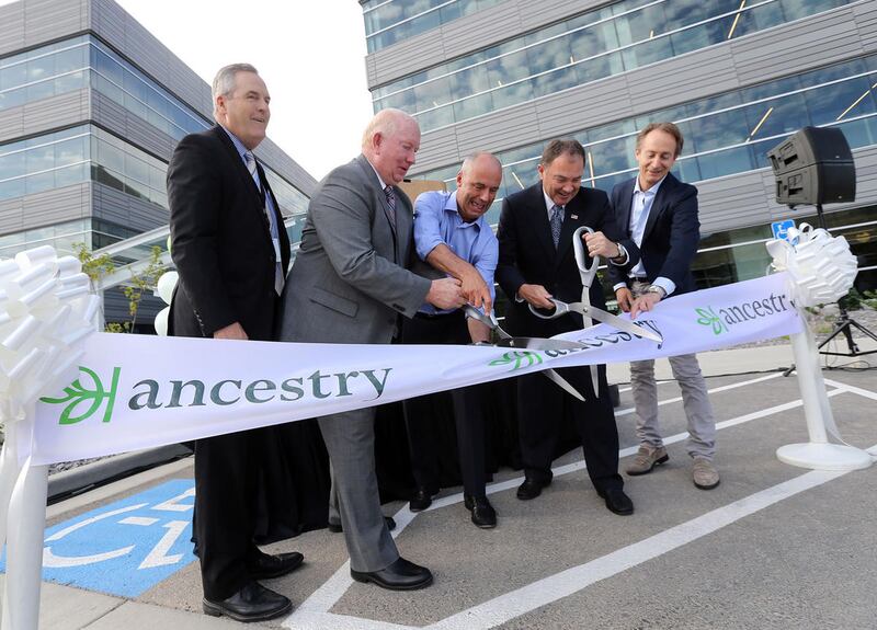 Val Hale, executive director of the Governor's Office of Economic Development, left, Lehi Mayor Bert Wilson, Ancestry CEO Tim Sullivan, Gov. Gary Herbert and Howard Hochhauser, chief financial officer for Ancestry, participate in a ribbon-cutting ceremony for the company's new headquarters in Lehi on Wednesday. Ancestry is the world's leading provider of online family history and personal DNA testing. For the past three decades, Ancestry has been headquartered in Provo and has focused on making family history accessible to millions of people around the world. The company has more than 1,300 employees globally, 1,000 of whom are based in Utah. The new $35 million facility, located just a few miles off I-15, sits on 10.5 acres and feature a modern design with floor-to-ceiling windows.