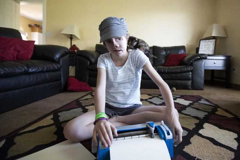 Seated cross-legged on the floor and leaning over her Braille writer, she listed other marks of progress, peppering her comments with occasional pre-teen sarcasm, the Standard-Examiner reported.