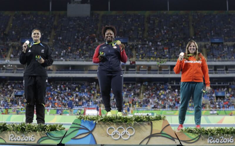 New Zealand shot put silver medalist Valerie Adams, left, posted her congratulations to gold medalist Michelle Carter of the United States and bronze medalist Anita Marton of Hungary and shared a photo of the three of them on her Facebook page.