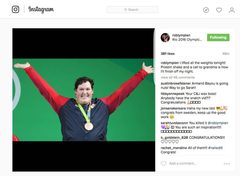 Weightlifter Sarah Robles was all smiles on the podium to accept the bronze medal in the 75 kg-plus division this weekend at the Olympics in Rio de Janeiro.