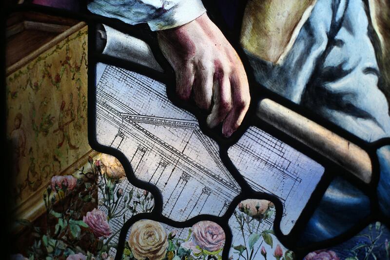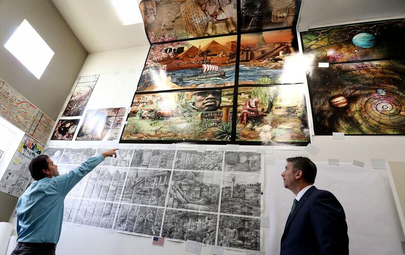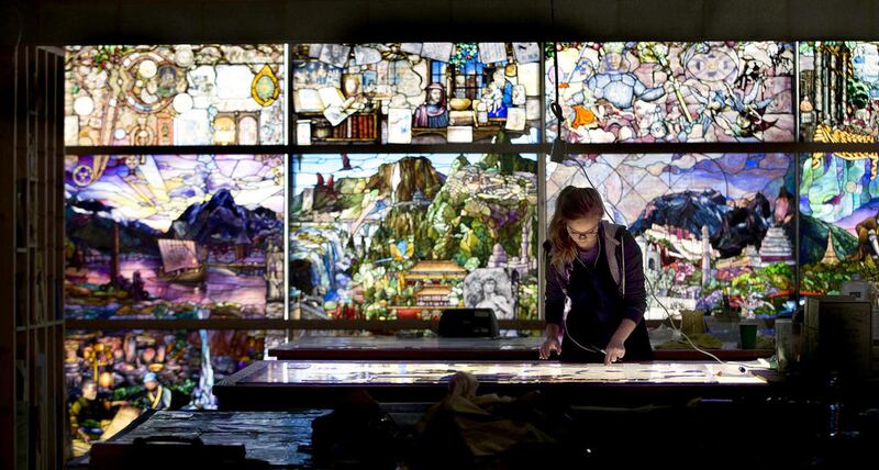 When completed, “Roots of Knowledge” will rise 10 feet in the air, stretch 240 feet across the school's undulating library wall and contain more than 80,000 pieces of hand-painted glass. One panel, depicting Alexander the Great, includes nearly 3,000 pieces alone.