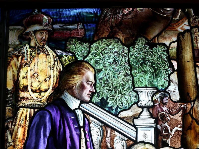 In one panel, Benjamin Franklin and John Adams write the Declaration of Independence by candlelight. In another, a tiny Isaac Newton stands on the shoulder of Hobbes’ Leviathan, a nod to the physicists’ famous words: “If I have seen further, it is by standing on the shoulders of giants.”