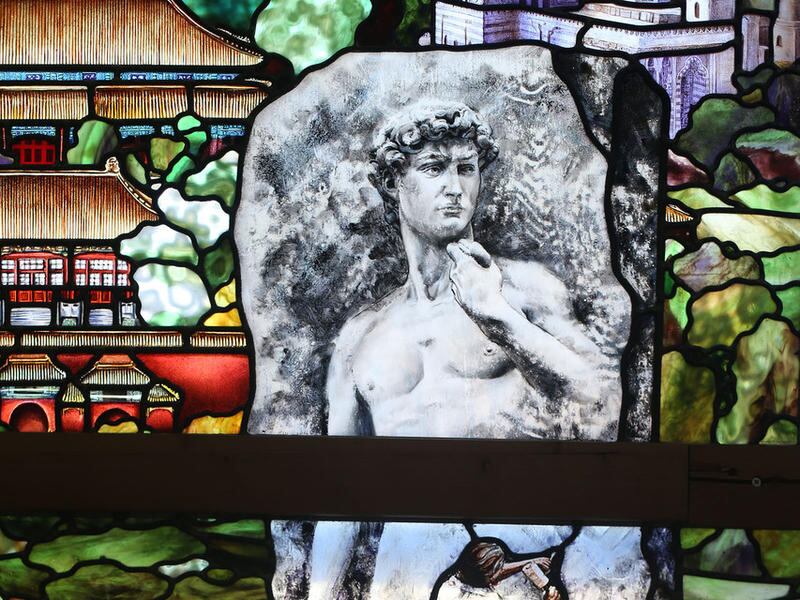 In between, 78 panes of stained glass trail through entire civilizations, work their way through the invention of the telephone, touch down in Harlem to witness the Renaissance, visit with the leaders of the women's suffrage movement in America, Kublai Khan in China and the Jameh Mosque in Iran.