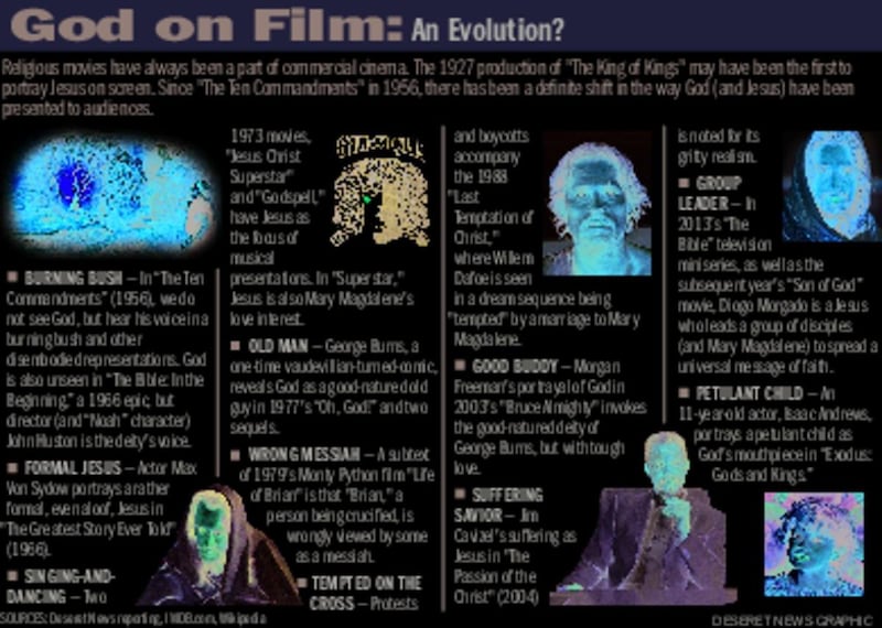 Today's digitally projected deity is far from the disembodied voice Charlton Heston, as Moses, encountered in the 1956 epic "The Ten Commandments." That 220-minute film — which had its first public screening in Salt Lake City — took a reverent attitude toward God, choosing not to physically depict him, but rather to use Heston's voice in the burning bush scene and other, unidentified voices for God in subsequent scenes.