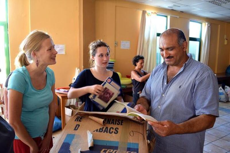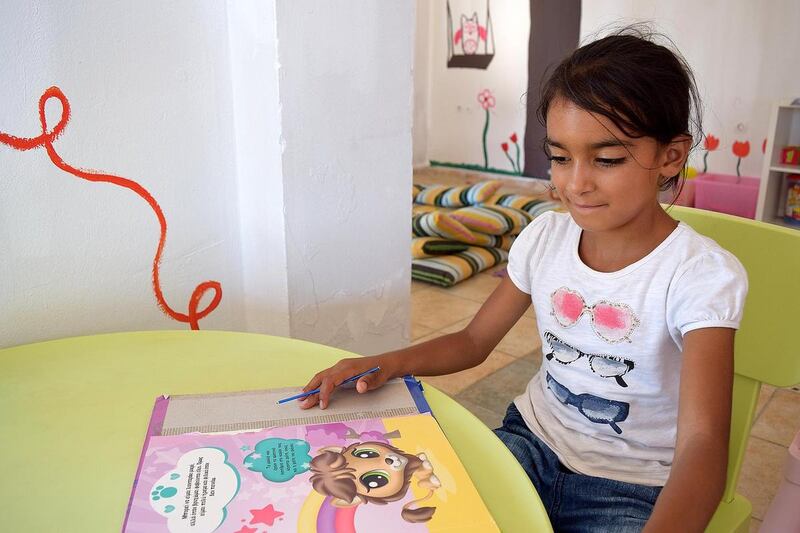 Inside the resort’s old poolside restaurant, crooked children’s drawings paper the bar and orange ribbons decorate the walls. A few small art tables sit where dining tables once likely stood, and shelves hold a collection of illustrated books, most of them in Greek. A shipment of donated books in Arabic has just arrived, and Al-Hamdan grins as he handles each book, picking out those best for teaching children in Arabic and in the new languages they’ll need to pick up.