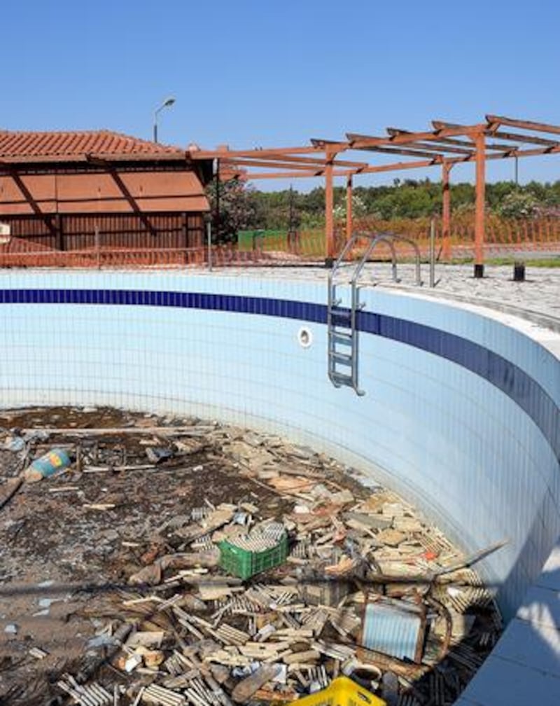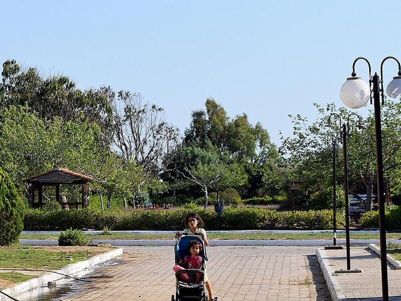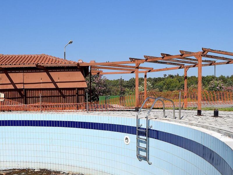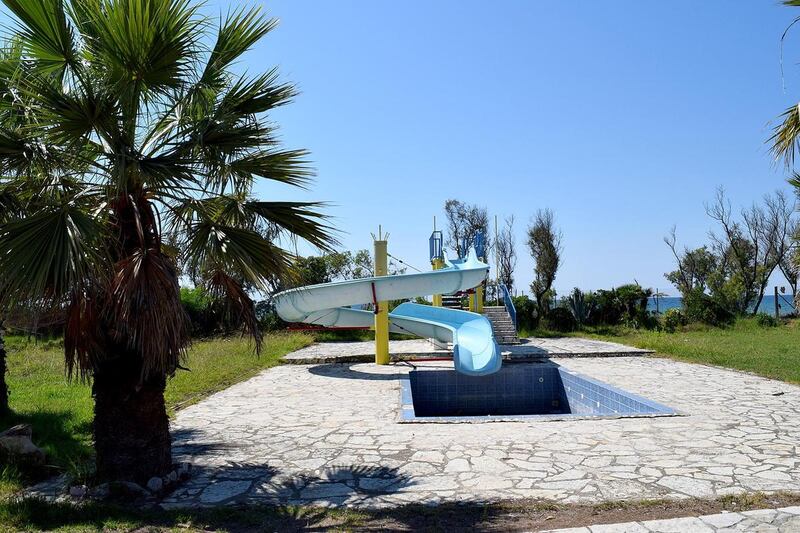 But a few steps from the beach, past the salty Mediterranean breeze and shouts of laughter, swimming pools are muddy with debris. A blue and yellow water slide bakes in the sun, and matted weeds cling to the cobblestone path to the beach. A tired-looking woman in a red hijab and long, black pants mops one of the stucco beach villa porches.