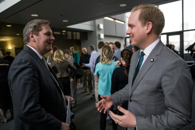 Doug Wilks, left, editor of the Deseret News, and Burke Olsen, the newly-named head digital officer for the Deseret News, talk after a staff meeting in Salt Lake City on Dec. 21, 2016. | Spenser Heaps, Deseret News