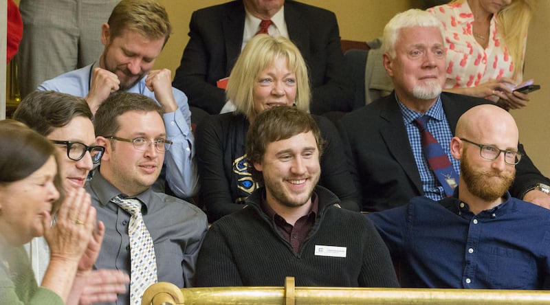 Members of the LGBT community and allies celebrate Friday, March 6, 2015, as the Utah State Senate passes SB296, a nondiscrimination/religious liberty bill. | Scott G Winterton, Deseret News