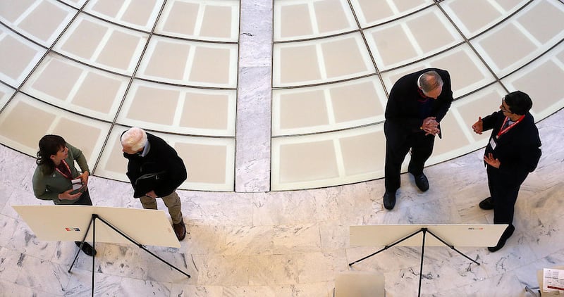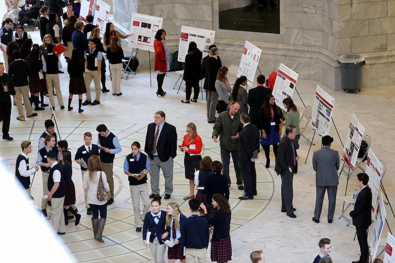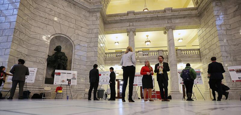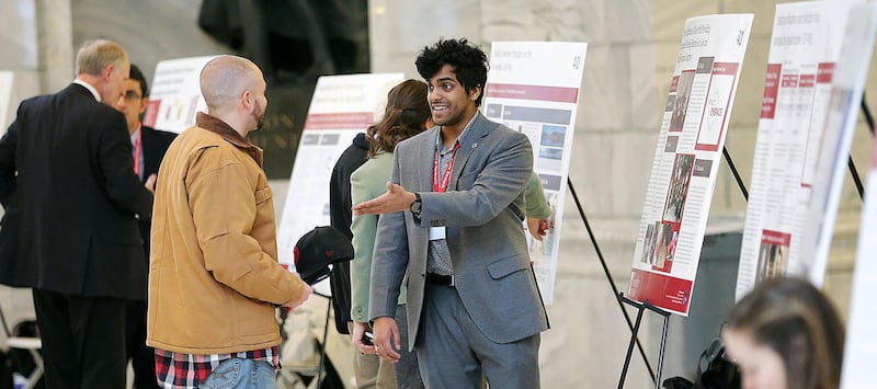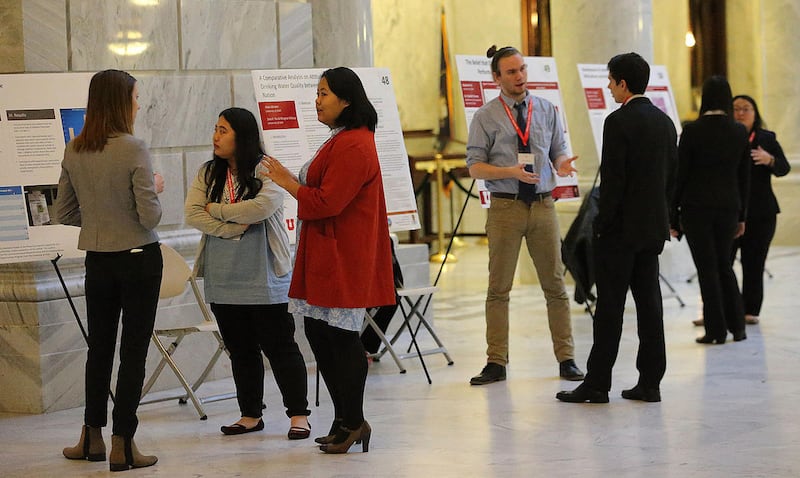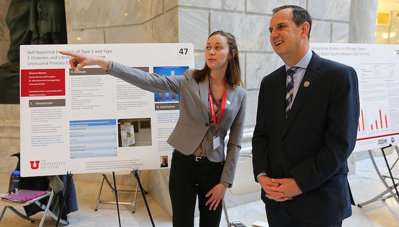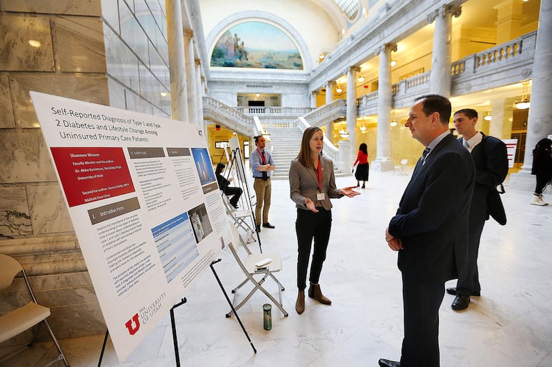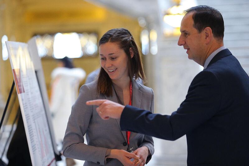 University of Utah student Mohan Sudabattula, right, talks with Alan Kirkham, a certified nursing assistant in Salt Lake City, about his research during Undergraduate Research Day at the Capitol on Tuesday. During the event, students at the U. and Utah State University presented research posters to legislators and guests in the Capitol rotunda. The program, now in its 17th year, gives lawmakers and the public a glimpse of the breadth of research programs at the state’s two public research universities and reinforces the value of state-funded higher education. By explaining their research in clear, nontechnical terms to attendees, presenters practice communicating their work succinctly and accessibly. This year, the presenters hailed from broad disciplines in the physical, health and social sciences.