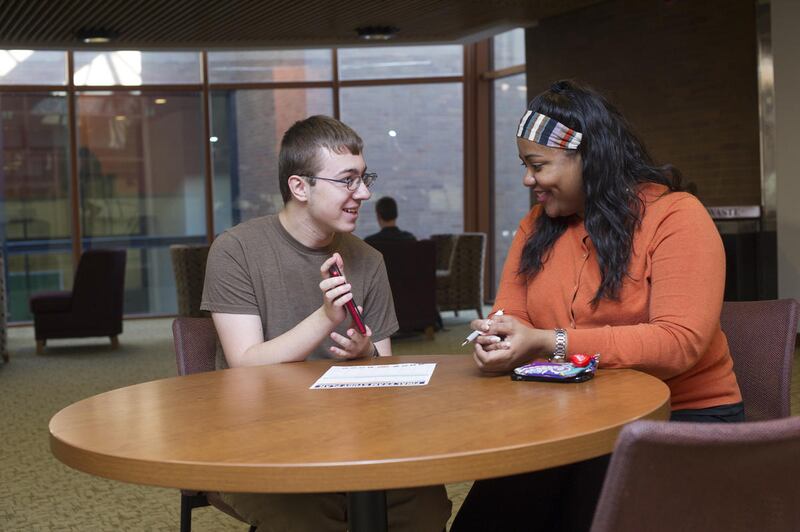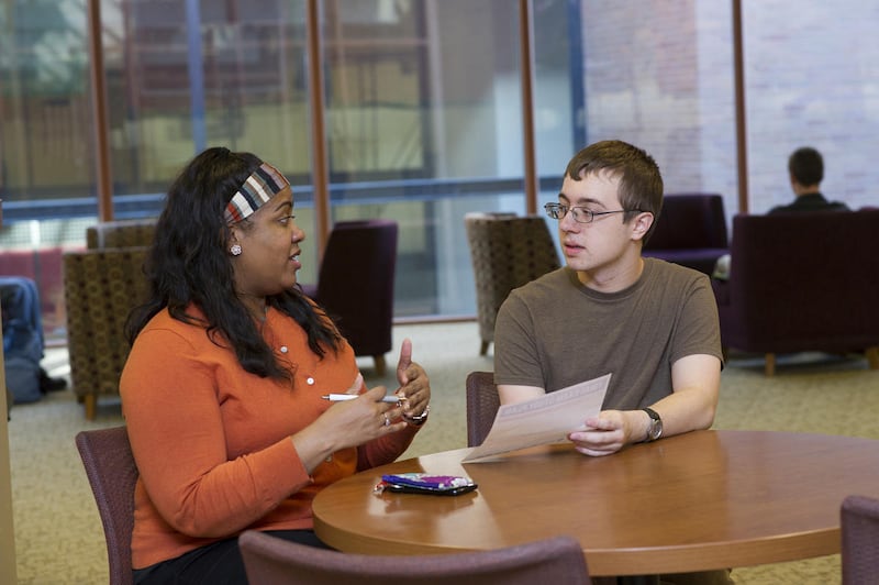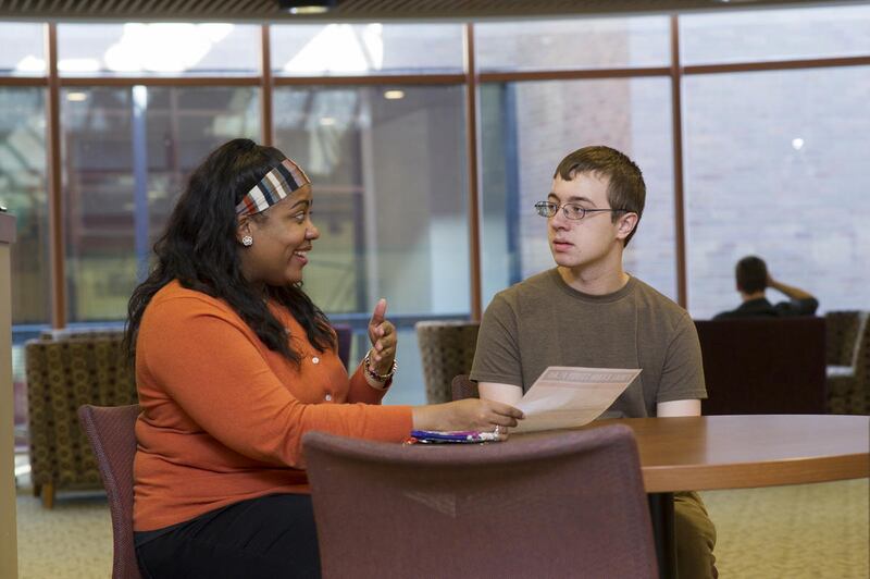 Rochester Institute of Technology freshman Nathan Terrell, who has autism, meets with his mentor Atiya Smith, a licensed therapist and doctoral student in counseling at the University of Rochester. | A. Sue Weisler, Rochester Institute of Technology