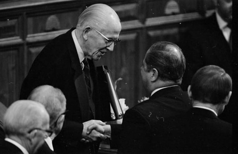President Ezra Taft Benson, then president of the Quorum of Twelve, shakes hands with new Presiding Bishop Robert D. Hales at LDS general conference in April 1985. | Deseret News archives