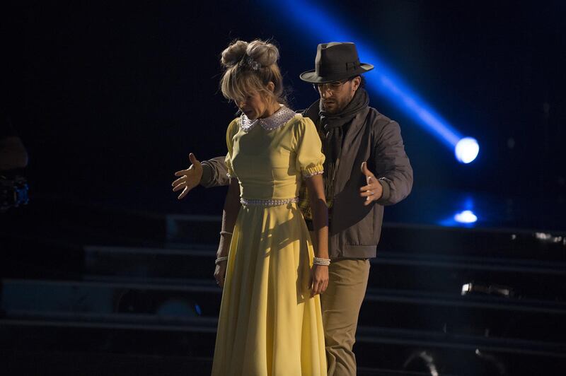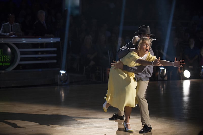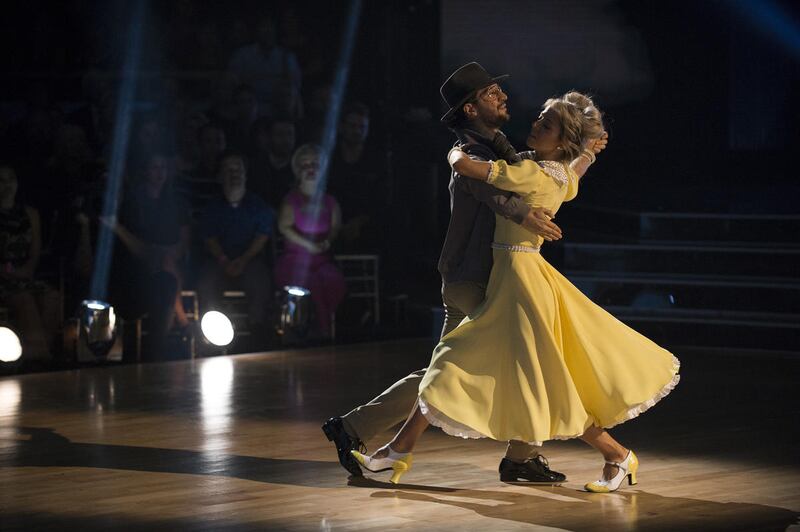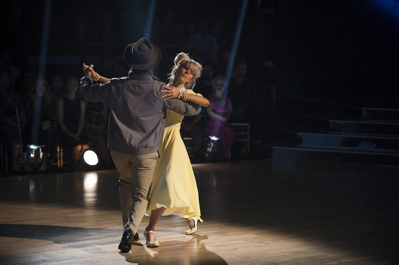 Dressed in a yellow-collared dress, Stirling lost her composure once while Ballas led her across the floor, and was openly emotional following the performance.