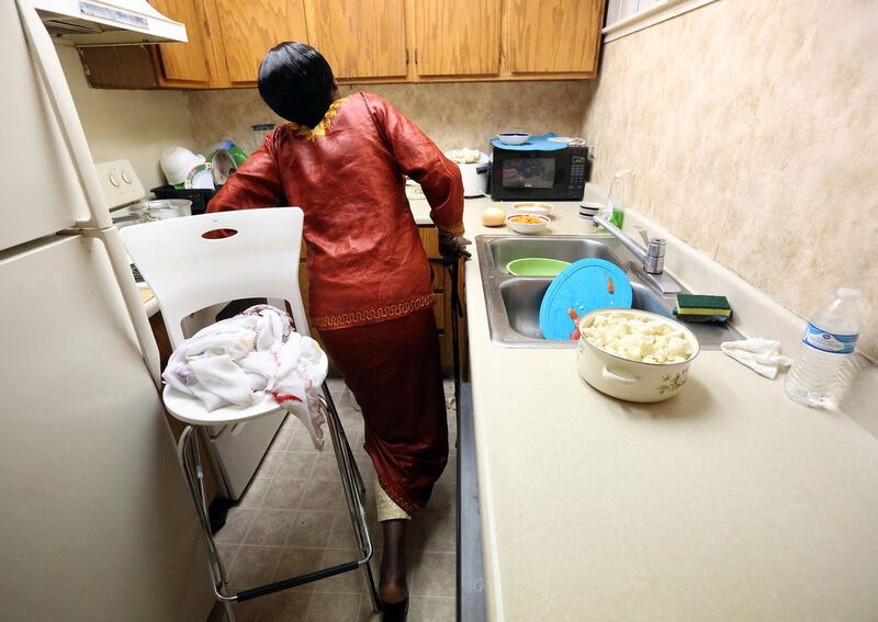 Christine Mukankusi, a refugee from the Democratic Republic of the Congo, uses a tall chair to prop her up while cooking at her home in South Salt Lake, on Wednesday, Oct. 4, 2017. Mukankusi suffers from back pain.| Kristin Murphy, Deseret News