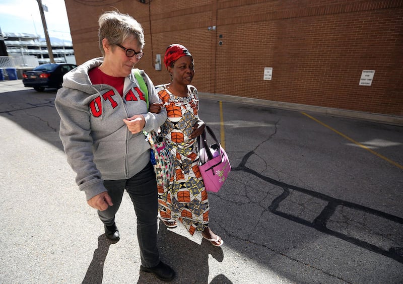Cherie Mockli, licensed clinical social worker, hugs Christine Mukankusi goodbye after a knitting group meeting for refugee women at the Utah Health and Human Rights office in Salt Lake City, on Tuesday, Oct. 3, 2017. | Kristin Murphy, Deseret News